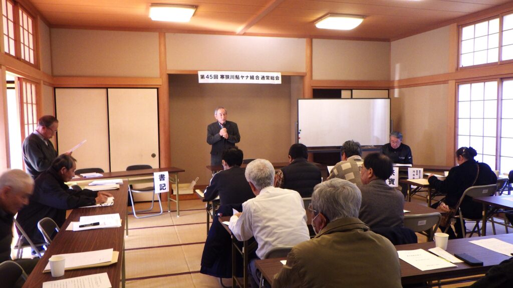 令和8年2月15日午前10時から、布里コミュニティーセンターにおいて「令和8年度寒狭川鮎ヤナ組合通常総会」が行われました。総会には、組合員総数210名の内、当日出席・委任状出席合わせて155名の組合員が出席し、10の議案について協議の結果全て原案どおり承認されました。